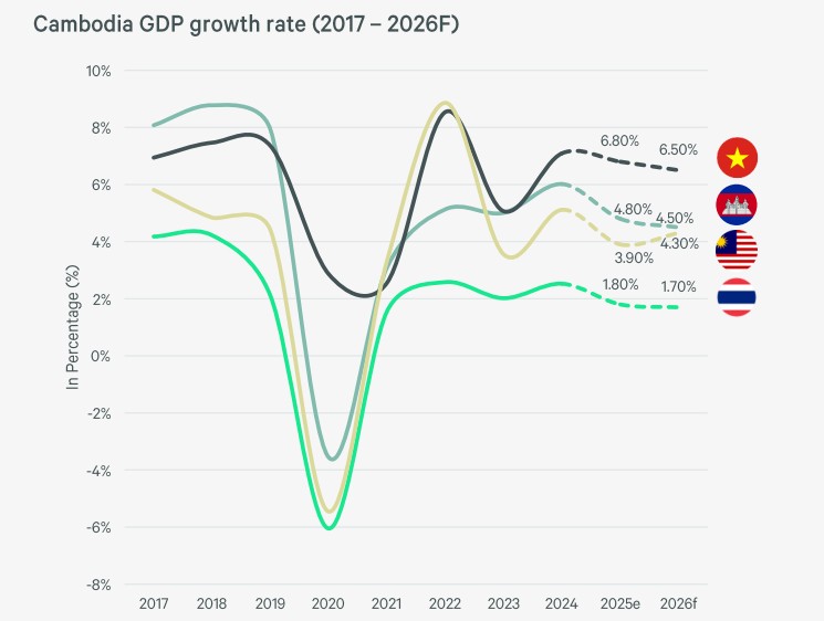Prognozuje się, że PKB kraju wzrośnie o 4,8% w 2025 r. i 4,5% w 2026 r. – umiarkowane tempo, plasujące Kambodżę w środku stawki w regionie. Wietnam nadal wyróżnia się, z prognozami na ten rok bliskimi 6,8%. W całej Azji Południowo-Wschodniej większość prognoz wzrostu została w ostatnich miesiącach skorygowana w dół, z wyjątkiem Singapuru, gdzie wzrost pozostał stabilny. Korekty te wskazują na szersze spowolnienie w regionie, ponieważ globalny handel i inwestycje pozostają na niskim poziomie.