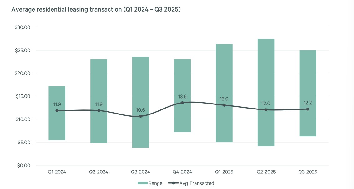 Transakcje ustabilizowały się, a średnie czynsze za najem lokali mieszkalnych oscylują wokół 12 dolarów za metr kwadratowy. Górny przedział transakcji wykazuje stopniowy wzrost, sygnalizując ostrożne ożywienie popytu na wynajem.